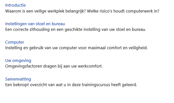 Gecombineerd met de assessments wordt met deze training voldaan aan de wettelijke eisen over voorlichting en instructie beeldschermwerk. De training duurt circa 15 minuten en kan tussentijds worden onderbroken.